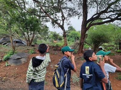 We walked further ahead and passed through a pond where students identified a pond heron which was camouflaged, a huge bird on a small island in the pond which they identified as grey heron, and they also spotted a cormorant. We discussed about cormorant drying its wings in the sun, and why don't ducks do that? Well, its a question for you guys to ponder over.